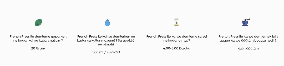 French Press için başlangıç oranı 1:15 (20 gram kahve – 300 ml su). Daha gövdeli kahve için 1:12, daha hafif kahve için 1:17 oranını deneyebilirsin.